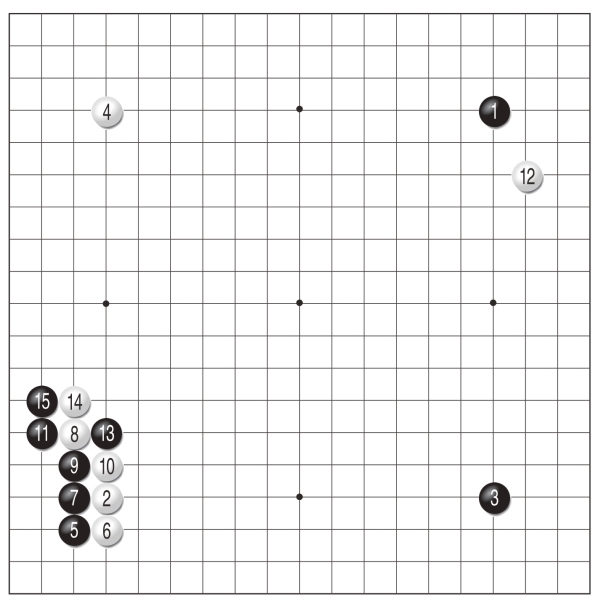 双方二连星开局,黑5至黑11是常见的点三三定型,白12先保留角部手段,选择脱先他投,是AI的推荐下法之一。对此,黑13断打,再黑15爬是对白棋脱先的惩罚性下法,之后又会引发哪些变化呢?