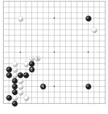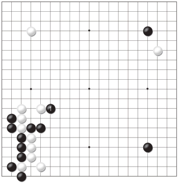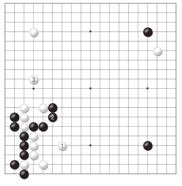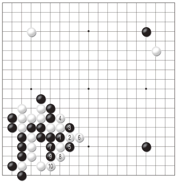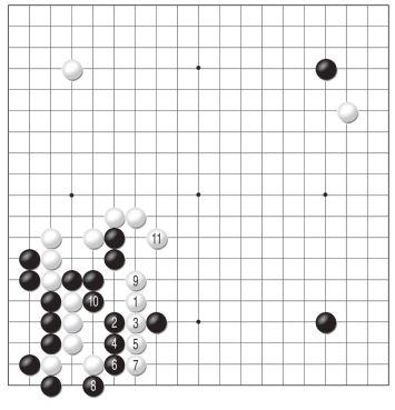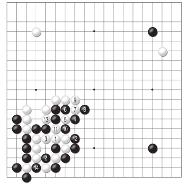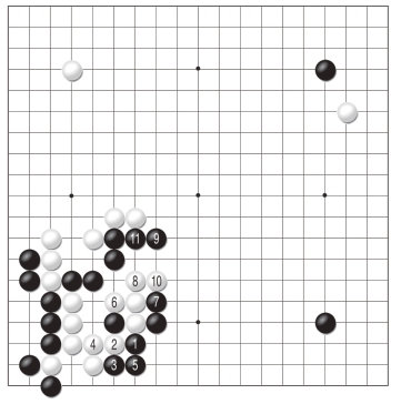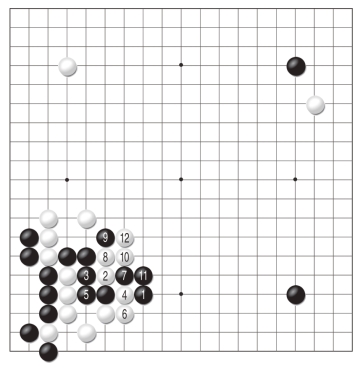 黑1跳是为了不让白棋舒服地出头,对此白2位夹的反击让黑棋有些难办。黑3以下毫不退缩,可惜强硬的态度却换不来作战的胜利,至白12,黑棋全部阵亡。