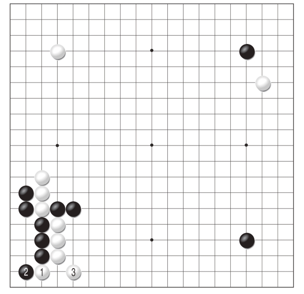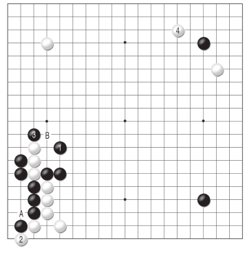 黑1跳攻击白棋三子,白2扳是似小实大的一手。黑3顶有力,此时白棋三子需要战略性舍弃了,将来白棋无论是走A位或B位都是先手便宜,可根据情况进行选择。