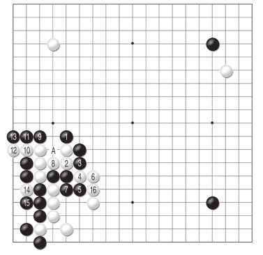 黑1扳过分,白2、白4顶断是强烈的反击手段,当黑5、黑7延气时,白8是谨慎地收气好手,如随手走16位,被黑棋A位挖打,白棋惨遭反杀。至白16,黑棋慢一气被杀。
