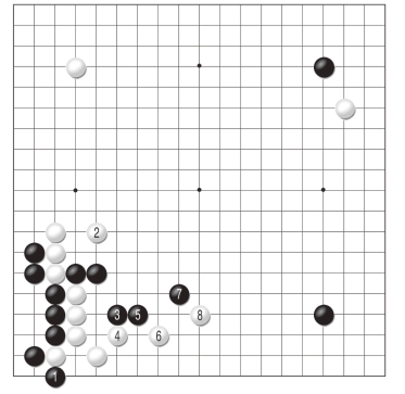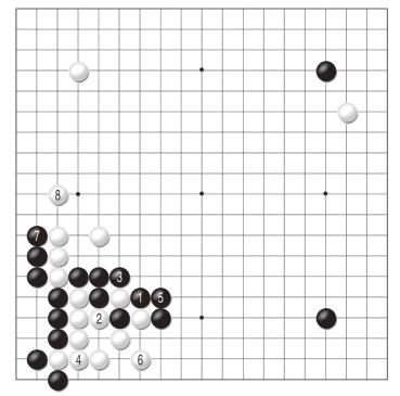 黑棋只能走1位打吃,白2先手提子。之后白4位粘确保活棋十分重要,黑5要补一手,白6小尖稳健。黑7是必然的下法,否则白棋走7位是先手。至白8跳,白棋两边均得到安定,黑棋中腹数子却还是受攻的棋形,显然白棋有利。