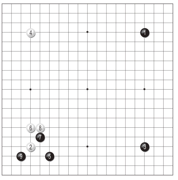 双方都是二连星开局,黑5挂角,白6单官守角,这在十年前算是流行的开局,AI认为对于白6的单官跳,黑棋应该选择7位飞点,白8贴时,黑9再点三三,这一下法有什么必然性呢?我们马上来研究一下。