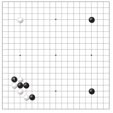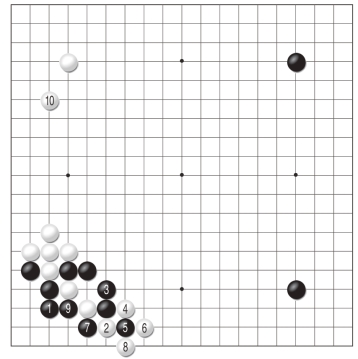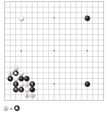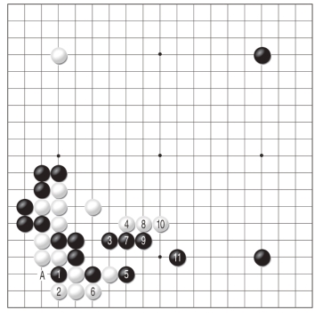 白1打吃反击,不让黑棋轻易脱身,黑2反打,白3提子,黑4再打,初棋无劫使得白5只能忍耐,此时黑棋有没有办法吃住白棋角上两子是这一变化能否成立的关键。黑6选择直线攻击,效果不佳,至白11,黑棋面临崩溃。