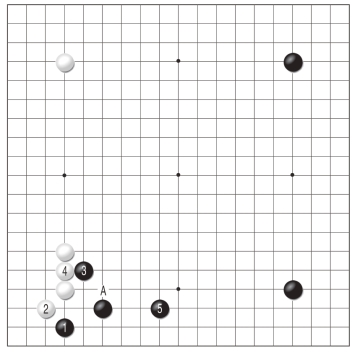 白1如果粘在外面,黑2必然会点三三,白3只能接住,黑4扳过,白棋角空被夺,这个结果显然是黑棋便宜了。