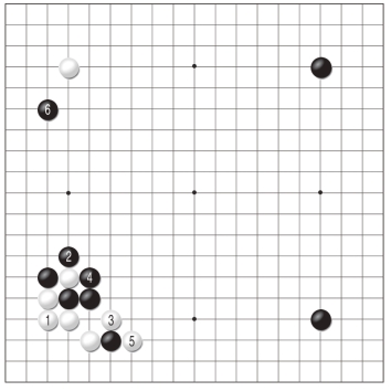 白1尖顶反击,对此黑2先冲一下,再4位退回简明,白5粘上,黑6拆边,算是双方均可接受的变化。