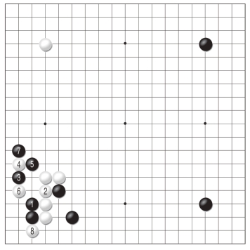 黑1爬是明显的俗手,白2接住厚实,黑3飞做活,白4靠住是强手,黑5如走6位退虽然可以做活,但龟缩在角上总是有些委屈。黑5扳出,白6、白8把角地尽收囊中,黑棋十分无趣。