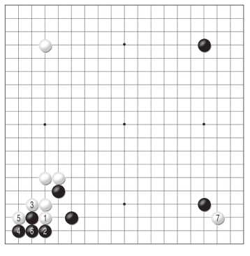 白棋必须下在1位挡,黑2扳,白3拐,至黑6,与上图相比,黑棋角部目数明显缩水,白7脱先他投,这个变化白棋是可以接受的。