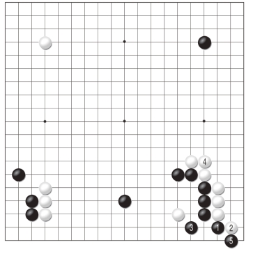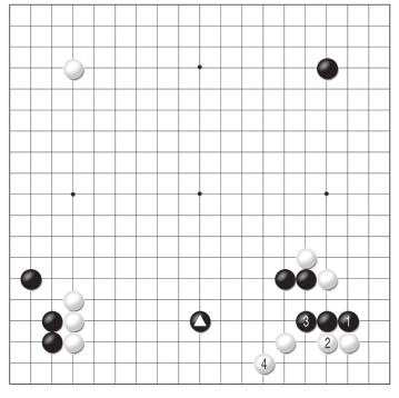 还记得AI的招牌下法吗?不错,就是黑1、黑3的二路扳虎,不仅是这个局面,凡是类似棋型AI都会这样下,白4是稳健的下法,但有缓手之嫌,黑5扳似小实大,本图黑棋目数上远优于图三。