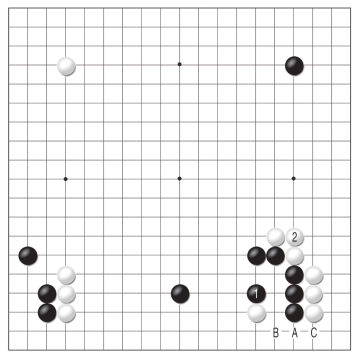 黑1靠看起来是形之要点,但在这个局面下却是一步缓手。白2接,补住外面的断点,将来白A、黑B、白c还是先手,白棋目多棋厚,非常满意。
