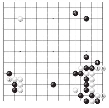 白如1位打吃,黑2拐打一下是先手,再4位消劫,本图与图六比较区别不大,同样是黑棋优势的结果。