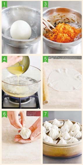 6 面皮中包入适量馅料,均匀地提褶儿捏成包子生坯。