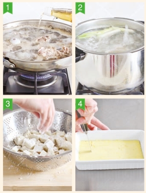 4 鸡蛋加少许盐和1汤匙凉开水打散。取长方形碗,碗壁抹些香油,将蛋液倒入,开水上锅,小火蒸5分钟左右成蛋羹,取出,用小刀划小方块,并用勺子轻轻撬散,然后包保鲜膜,冷藏保存。