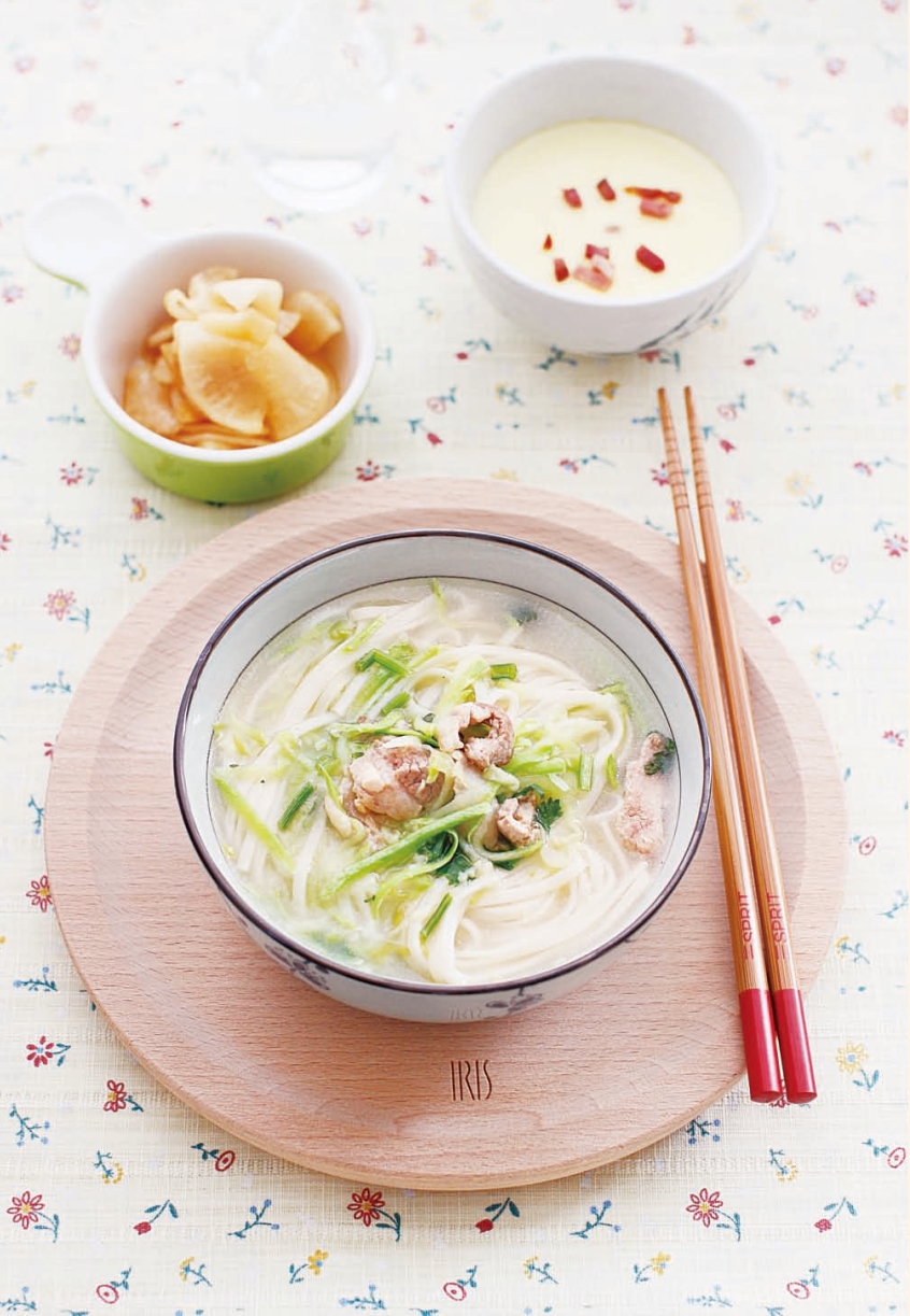 2 高压锅置火上,加入足量水烧开,捞入汆好的猪棒骨,再次煮沸,放入调料包、葱段、姜片和1茶匙盐,继续煮5~10分钟后,盖上锅盖,转小火炖1.5~2小时至肉烂。捞出猪棒骨放凉,待其表面变干后包上保鲜膜,放入冰箱冷藏。骨头汤盛入大碗里,也放进冰箱冷藏。