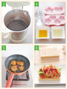 6 取1片黑麦吐司,放上2片里脊肉、生菜叶和甜椒丝,盖上另1片吐司,即成照烧肉三明治。