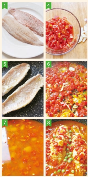 红烩鱼片盖浇饭 红鲷鱼1条,番茄2个,洋葱1/4个,大蒜3瓣,青豆20克,面粉20克,盐3.5克,白胡椒粉0.3克,番茄酱2汤匙,高汤1碗,橄榄油1汤匙,大米适量