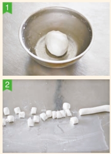 2 取出糯米粉团,分成4份,轻轻搓揉成长条,切成小剂子,将小剂子逐个轻轻搓揉成小圆子,全部搓好后覆盖保鲜膜过夜。桂花圆子甜汤完成。