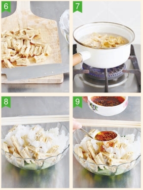 6 黄瓜切小滚刀块,加1/2茶匙盐抓匀,静置10分钟后,将渗出的水倒掉。腐竹清洗干净,切小块。
