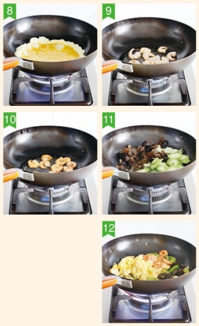 8 鸡蛋充分打散,调入水和1/4茶匙盐打匀。炒锅放油烧热,下入蛋液,快速炒散至八分熟,盛出,备用。