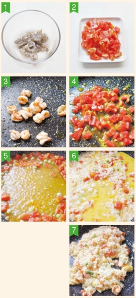 豌豆番茄虾仁泡饭 鲜虾12只,中号番茄1个,鸡蛋2个,豌豆粒30克,小葱1根,凉米饭1小碗,鸡汤1小碗,盐2克,胡椒粉0.3克,料酒1茶匙,淀粉1茶匙,橄榄油1汤匙