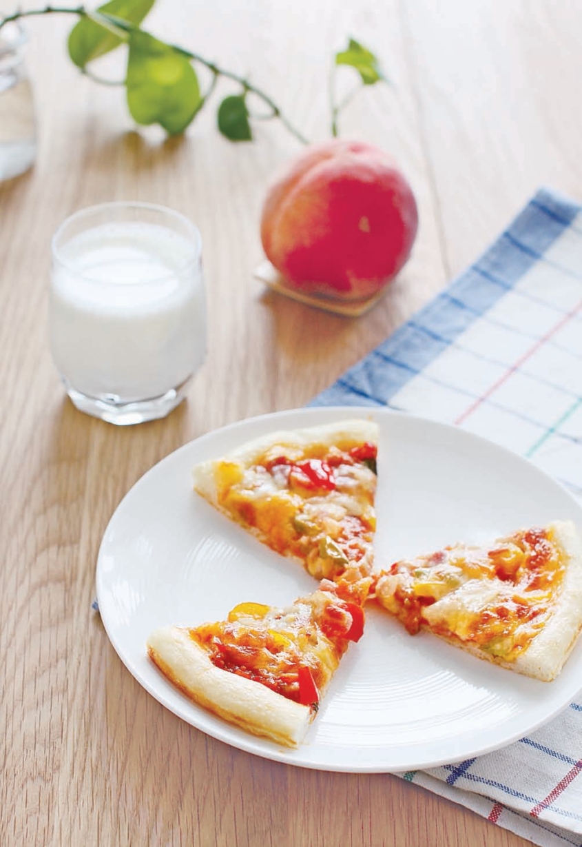 7 案板上铺好一张紫菜,沿对角线方向铺约2/3长的米饭(一角留出不铺),再铺上豆芽、肉片和鸡蛋条。