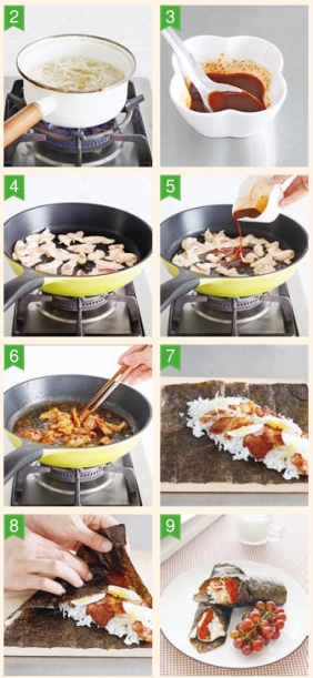 紫菜手卷 紫菜6张,熟米饭约150克,鸡蛋1个,薄五花肉片100克,豆芽50克,生抽2汤匙,白糖2茶匙,韩国辣酱1茶匙,料酒1茶匙,橄榄油适量