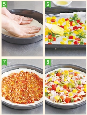 彩椒培根比萨 高筋面粉140克,酵母、白糖各1茶匙,盐3/4茶匙,红彩椒、黄彩椒、绿彩椒各1/4个,培根1片,马苏里拉奶酪碎120克,温水95克,绞肉100克,洋葱40克,蒜1瓣,汉斯意大利面酱250克,橄榄油7茶匙,白葡萄酒2茶匙,现磨黑胡椒粉1/4茶匙