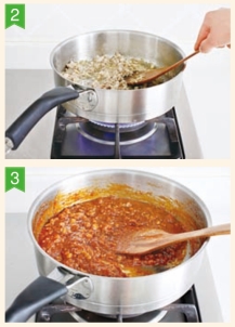 2 洋葱、蒜分别去表皮,切碎末。锅内加入6茶匙橄榄油烧热,倒入洋葱碎和蒜末,小火煸炒至洋葱透明,加入绞肉,大火炒散。