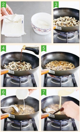 8 取出蒸好的豆花,将素菌菇卤浇在上面即成鲜香菌菇豆腐脑。