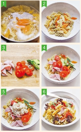 4 将火腿片、黄瓜片和圣女果片放入意面中。