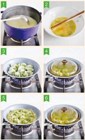 6 盖上锅盖,小火将蛋烘熟。蛋煎馄饨完成,装盘。