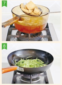 8 青萝卜切细丝。炒锅放油烧热,倒入萝卜丝不断翻炒,感觉有点儿干的时候少量多次淋入水,中途加入虾皮一起翻炒,最后调入盐,炒匀即可。