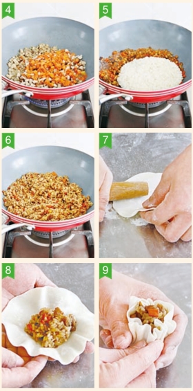 9 收拢,用手的虎口处将上端稍稍攥紧,留出花一样的张口,即成烧卖生坯。放入冰箱冷藏保存。