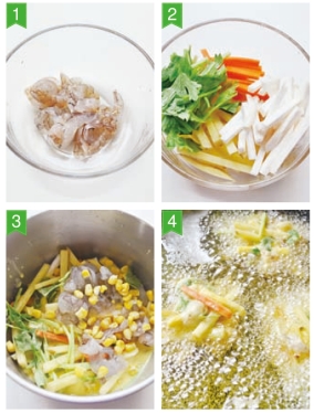 4 将色拉油倒入锅中,烧至约六成热,用铲子将食材舀起,呈饼状轻推入油锅,中小火炸2~3分钟后翻面。