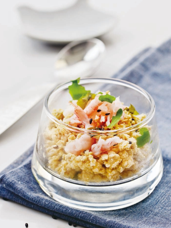 5 将豆腐泥盛到容器中,放上虾肉,拌匀即可。