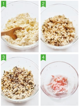 2 将干海带洗净盐分,入水泡发。将泡好的海带切碎,放到豆腐渣中,加入香油、盐和鱼生酱油搅拌均匀,放入微波炉中高火加热3 分钟。
