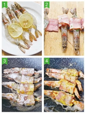 2 将法香碎放到虾肉上,培根一分为二,将大虾包裹。