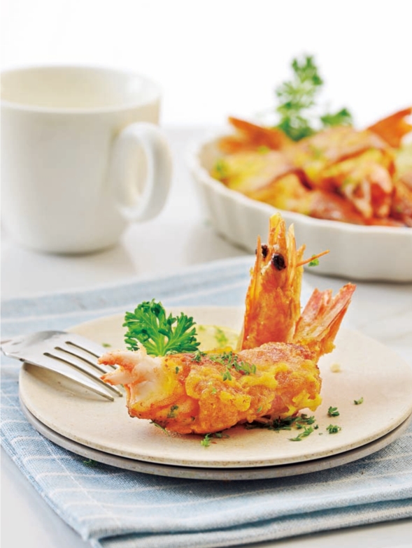 3 将锅烧热,放入适量黄油,使其化开。将裹好的大虾先蘸蛋黄后裹面粉,放入锅中小火煎制。