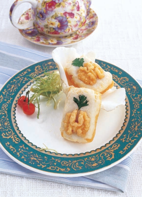 4 在每片馒头上都刮1层鱼肉馅儿,再放上1块核桃肉、1片香菜叶,成鱼托生坯。