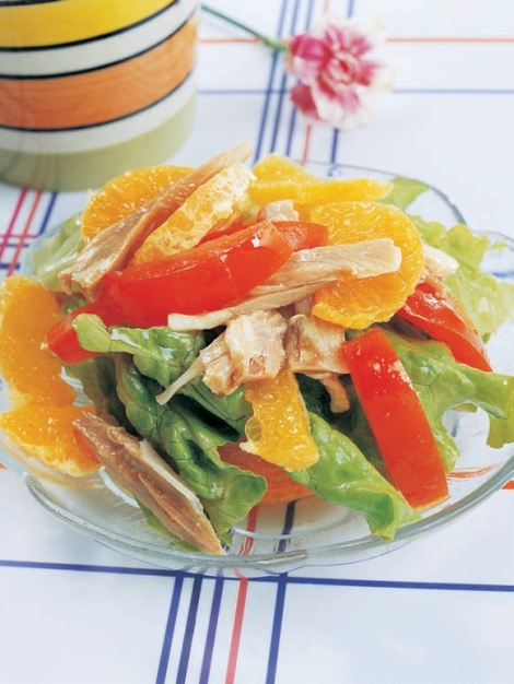 3 将橘子、番茄、生菜和烤鸭脯肉一起放入大碗中,加盐、柠檬汁和胡椒粉拌匀,盛入盘中即成。