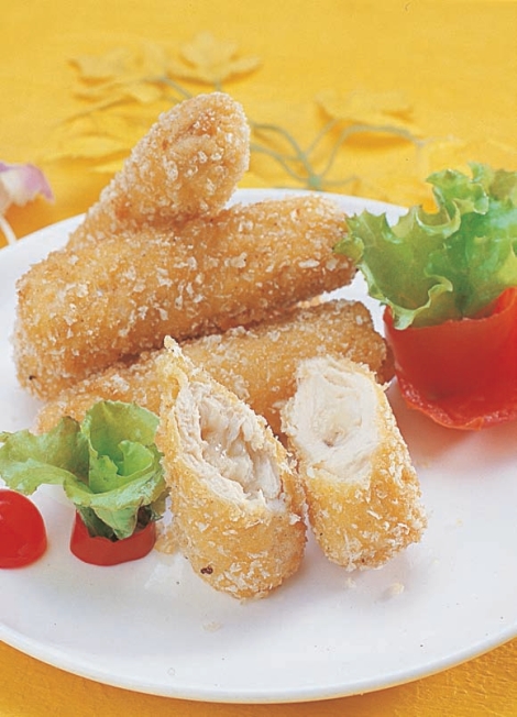 4 炒锅置火上,加入花生油烧至四成热,放入香蕉鸡卷,炸至呈金黄色时捞出,装入盘中即成。