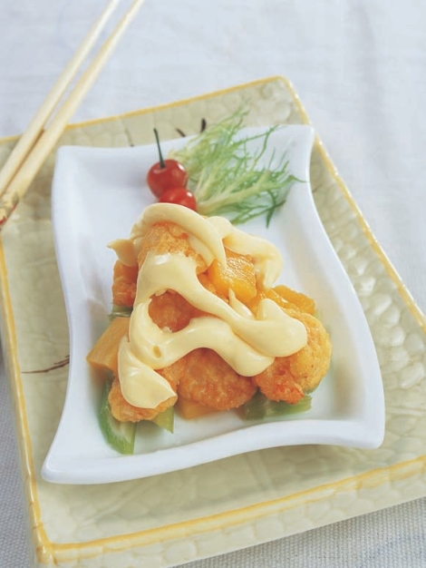 3 红虾仁中放入面粉、鸡蛋清、淀粉拌匀,再放入热油锅中,炸至呈金黄色,捞出,沥油,装盘。放入菠萝块,挤上沙拉酱即可。