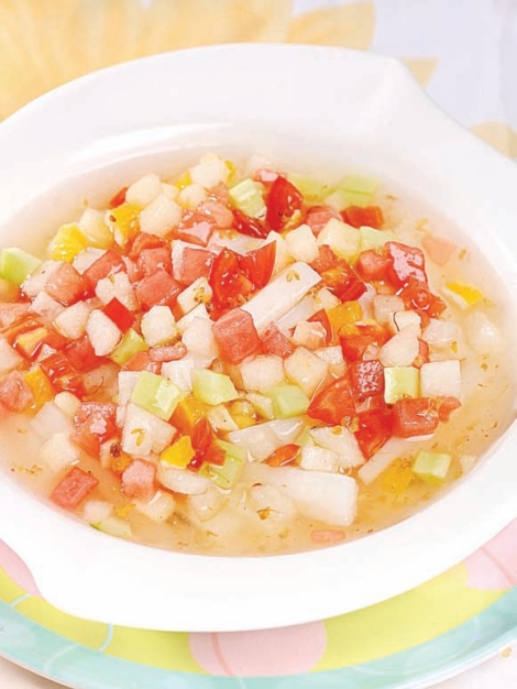 3 锅置火上,加入清水和冰糖,待冰糖化开后加水淀粉勾芡,再放入水果丁、桂花酱翻炒片刻,出锅后将其倒在山药上即可。