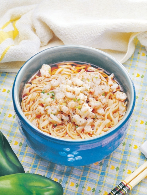 5 将面条煮好,捞入盛有酱油、盐、味精的碗里,再将炒好的虾仁倒入面条碗内即成。