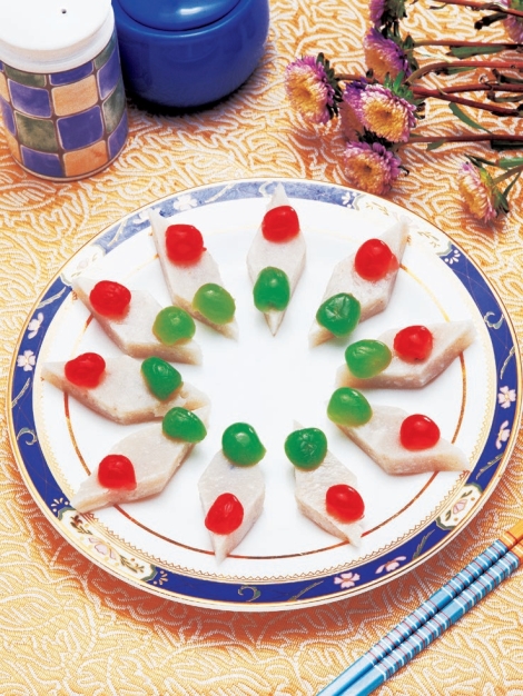 3 待山药泥凉后,改刀成菱形块,装盘,用樱桃点缀即成。