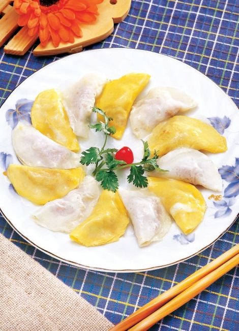 3 炒锅置火上,烧热,用生肥肉擦一下,将一匙蛋清倒入锅内,摊成小圆蛋皮,加上肉馅儿包成蛋清饺。同法包好蛋黄饺。将二色蛋饺上笼蒸10分钟即可。