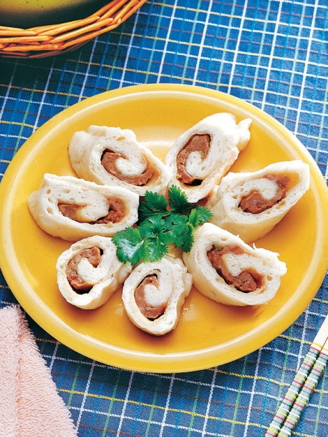 3 将醒好的面团放在案板上,擀成长方形片,抹上肉馅儿,卷成卷,按笼屉大小分成段,码入屉内,用旺火蒸15分钟。取出稍凉一下,切成小斜段即成。