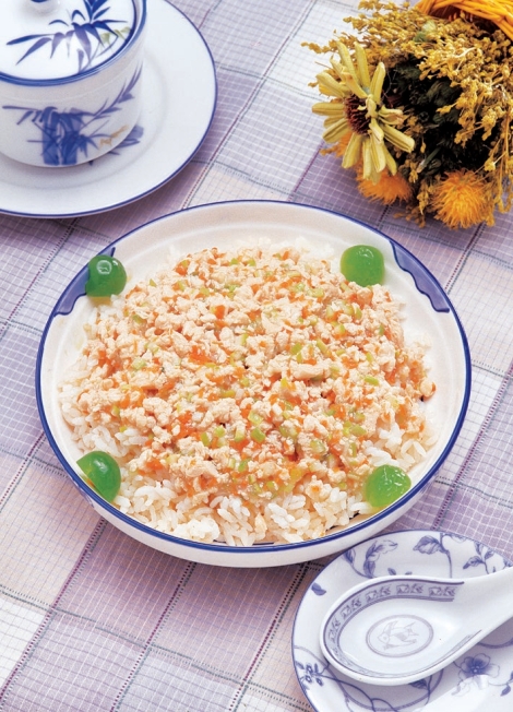 3 炒锅中放花生油烧热,加入鸡肉末、胡萝卜末、芦笋末,再放入调料,用筷子搅拌,使其混合均匀,炒熟后盛在软米饭上即可。