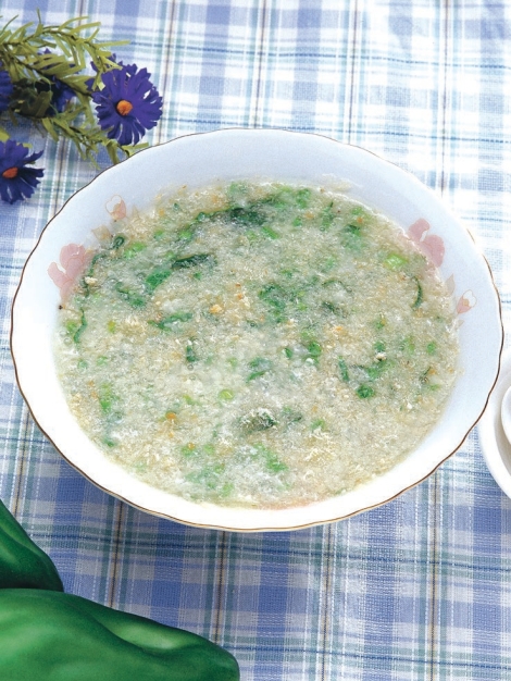 3 将鱼肉松和菠菜末放入粥内,加入盐调味,用微火熬几分钟即成。