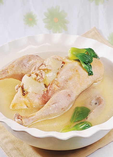 2 将柚子肉及核桃仁放入老鸭肚子内,加水、酒、姜和少许盐,用文火炖熟即可。