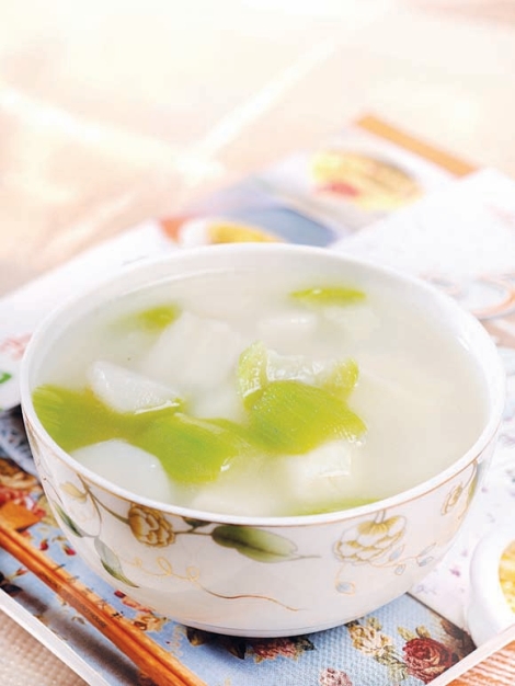 2 把马蹄块、丝瓜块放入锅内,加水煮至快熟时倒入大蒜泥,再煮3~5分钟,最后加入少许盐调味即可。
